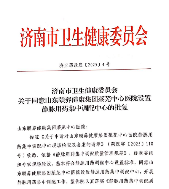 近日,山东健康集团莱芜中心医院收到《济南市卫生健康委员会关于同意山东颐养健康集团莱芜中心医院设置静脉用药集中调配中心的批复》,标志着该院静脉用药集中调配中心(以下简称“静配中心”)成功通过验收,也意识着该院在规范静脉用药管理、保障患者用药安全领域迈出关键一步,更为全年目标任务圆满收官注入强劲动能。